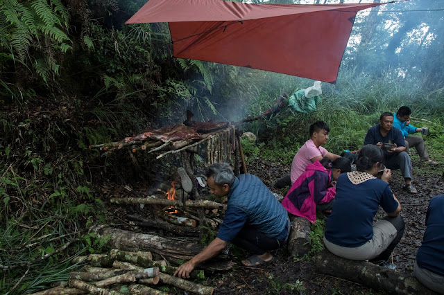 夜間 tama husung 與 tama dahu 帶著男丁們外出逛夜市,由 tama 領頭,青年幫忙搜尋獵物,小男孩跟著從觀察中學習;女人則在營地守候。狩獵也是布農山林生活中相當重要的一部分,尤其在寒冷潮濕的雲霧帶中,山肉是蛋白質與油脂的來源。這次山行山神給了我們一隻水鹿跟一隻飛鼠,也讓我們這幾天都有草藥味濃厚的水鹿湯暖身。下山前 tama husung 將已經在烤架上燻乾的水鹿肉分給眾人,讓大家帶回去給家人,這也是布農族最重視的「分享」,獵到獵物一定要分享給家人朋友。