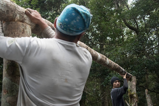 | 壯丁們辛苦採來的木頭先烤過防腐,才能作為柱子 |